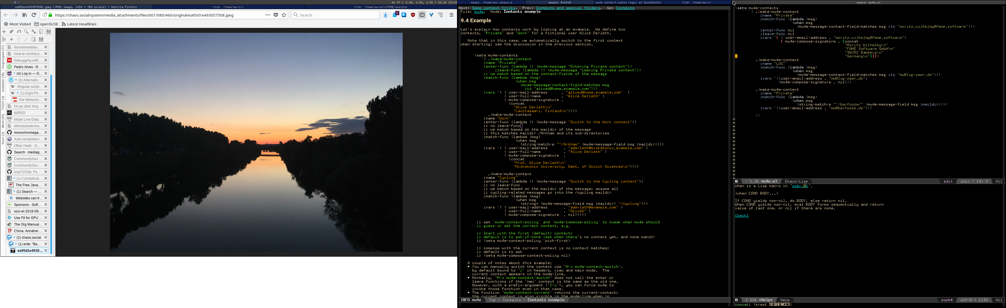Other Free Software™ I can recommend is ferm (iptables rules handling), sxiv (image viewer), Free- and NetBSD, the aforementioned mbsync (synchronize mails over IMAP), maim (screenshots), fish (friendly interactive shell), urxvt (terminal), spacemacs (extension package for emacs), emacs (operating system), vim (editor when I'm remote and not using tramp-mode in emacs because it's a bit slow), vi (when vim isn't installed), awk (which is forbidden to use in exams), ansible (server orchestration)